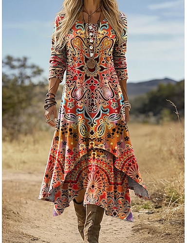Vestido Midi Boho de Mujer Vestido Shift Casual Diario Vacaciones Ajuste Regular Gráfico Geométrico Manga Larga Cuello Redondo Negro Rojo Naranja Azul Oscuro Verano Primavera