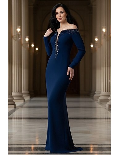 Sirena Trompeta Vestido Formal Largo Vestido de Noche Vestido de Noche Elegante Vintage Manga Larga Hombro Caído Fiesta de Noche Boda con Cristales Abalorios