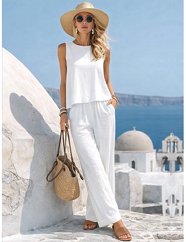 Mujer Conjuntos de lino y algodón Chaleco de lino y algodón Conjuntos de pantalones Sin Mangas Cuello Barco Color sólido Moda Ropa de calle Casual Diario Exterior Blanco Amarillo Beige Verano Ajuste