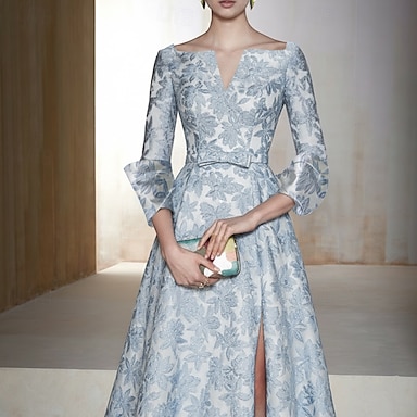 Corte A Hasta el Suelo Vestidos de noche Elegante Floral Pastel Manga 3/4 Escote Cuadrado Boda Formal Jacquard con Lazo(s) Abertura