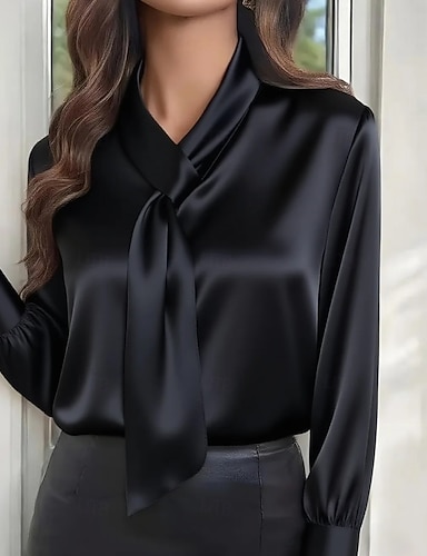 Mujer Elegant Elegante Top de satén Blusa Plano Elegante Diario Manga Larga Escote en Pico Tops regulares Diario Negro Blanco Caqui Otoño