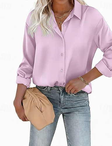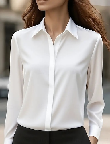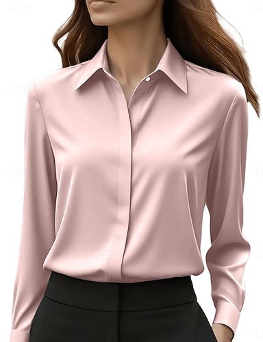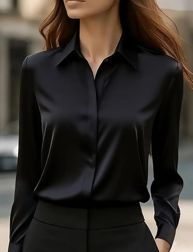 Blusa de satén para mujer, con botones, color liso, elegante, informal, de manga larga, cuello camisero, tops regulares, para oficina, trabajo, negro, blanco, azul marino, gris, primavera y otoño.