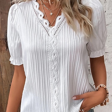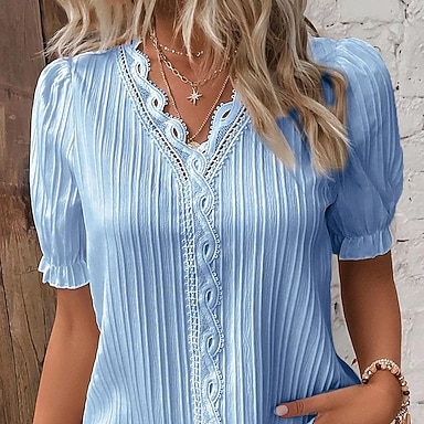Mujer Blusa Encaje Color sólido Elegante Casual Manga Corta Escote en Pico Tops regulares Diario Azul Piscina Negro Blanco Naranja Gris Verano Primavera Otoño