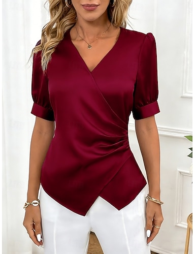 Mujer Camisa Camisa de raso Blusa Frunce Plano Elegante Clásico Moderno Manga Corta Escote en Pico Tops regulares Diario Festivos Noche Negro Vino Albaricoque Verano Primavera