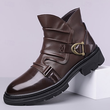 Botas marrones de piel sintética con correa para hombre: diseño moderno con detalle de hebilla, perfectas para salidas informales, moda de invierno y ropa de exterior.