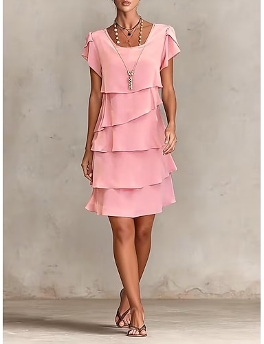 Mujer Mini vestido Vestido Cóctel Vestido Invitada Boda Vestido de raso Vestido Escalonado Elegante Clásico Fiesta de Noche Cita Noche Ajuste regular Color puro Manga Corta Cuello Barco Rosa Vino Rojo