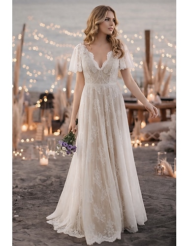 Boda en la playa Vestido de boda sexy de playa en color Vestidos de boda boho A-Line Escote en V Manga corta Barrido Tren de cepillo Encaje Vestidos de novia con fajas cintas
