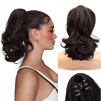 Extensión de cola de caballo con clip en negro y marrón de 30 cm. Cola de caballo ondulada corta con clip para mujeres. Cola de caballo rizada natural en capas para cabello corto y fino. Pieza