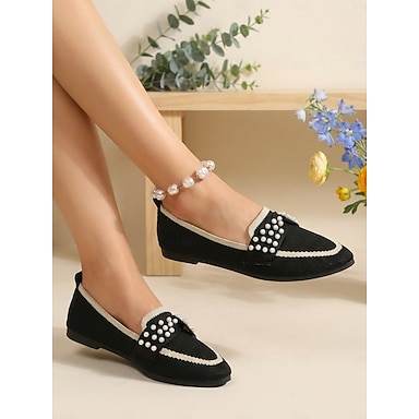 Zapatos planos transpirables para mujer con detalle de perla sintética - Zapatos casuales ligeros Flyknit para mujeres elegantes zapatos planos diarios para trabajo oficina viajes compras y uso diario
