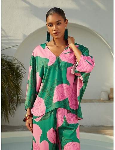 Mujer Caftán Bloque de color Flores Casual Hogar De Compras Verde Trébol Escote en V Holgado Manga Larga 3/4 de Mangas Vacaciones Casual / Diario Corte Ancho Escote en Pico Verano Primavera Primavera