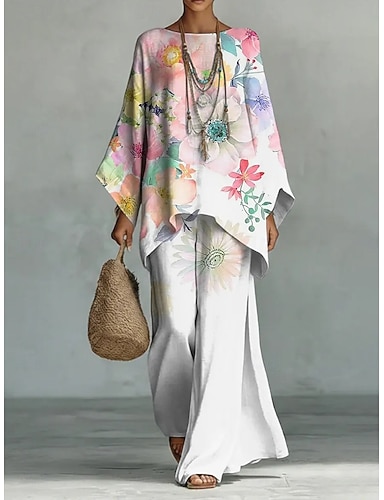 Mujer Conjuntos de pantalones Manga Larga Escote Redondo Floral Graphic Estampado Moda Ropa de calle Casual Diario Exterior Rosa Marrón Verano Holgado