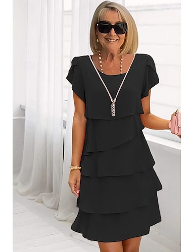 Mujer Mini vestido Vestido Cóctel Vestido Invitada Boda Vestido de raso Vestido Escalonado Elegante Fiesta de Noche Cita Noche Ajuste regular Color puro Manga Corta Cuello Barco Negro Otoño