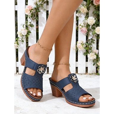 Sandalias de tacón cuadrado transpirables azul marino para mujer con detalle floral: zapatos de tacón abierto casuales y cómodos para el trabajo, la oficina, viajes, compras &uso diario