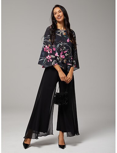 Blusa de mujer negra floral, manga 3/4, suelta, cuello redondo, informal, elegante, para vacaciones, primavera, verano y otoño.