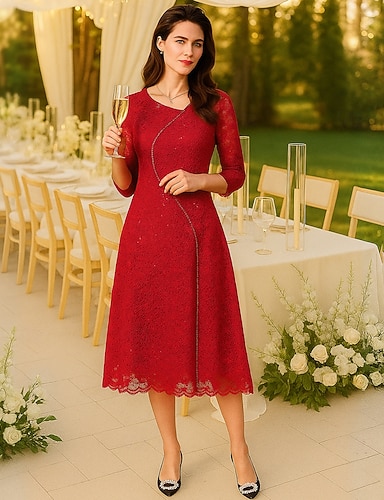Vestido de encaje de línea A columna de largo de té vestido de fiesta vestido de madre de la novia con manga 3/4 cuello en V cuello redondo elegante vintage fiesta de encaje con pedrería de encaje