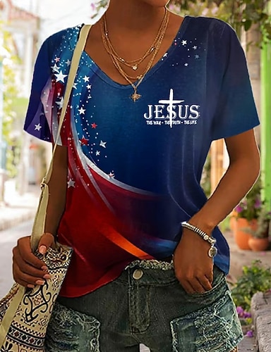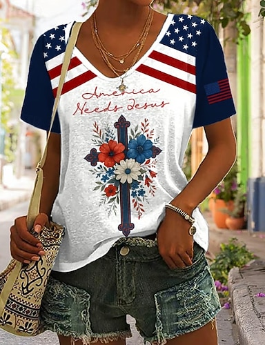 Inspiración del Día de la Independencia Camiseta Patriótica para Mujer Gráfica Bandera Vintage Estilo Clásico Manga Corta Cuello en V Ropa Regular Tops Diarios Impresión Blanca Verano Primavera