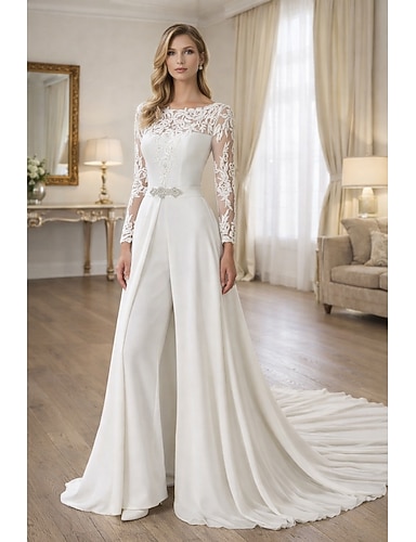 Mono Hasta el Suelo Vestidos de novia Sencillo Casual Manga Larga Escote de ilusión Encaje Tejido elástico con Fajas Detalles de Cristal Apliques