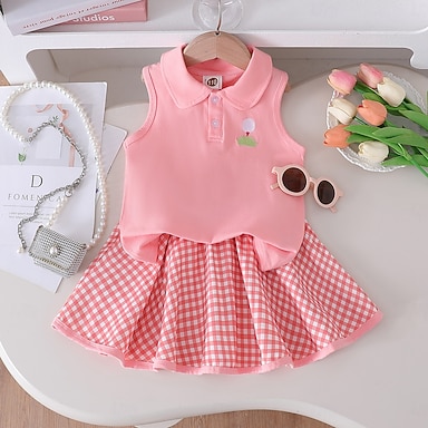 2 Piezas Niños Chica Plaid Trajes de vestir Conjunto Sin Mangas Activo Exterior 4 años + Verano Rosa