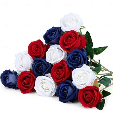 15 flores artificiales de seda para el 4 de julio, ramo patriótico con tallos largos para decoración del hogar, centro de mesa para fiestas, surtido, 3 colores.