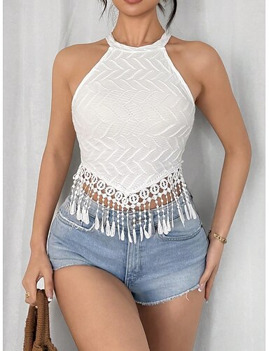 Mujer Camiseta sin mangas Blusa Camiseta sin mangas tipo camisola Camisa sin mangas Franja Plano Bohemia Clásico Casual Sin Mangas Cuello halter Tops cortos Diario Festivos Noche Negro Blanco Verano