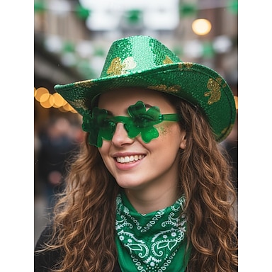 Sombrero de vaquero con lentejuelas de San Patricio para mujer (3 piezas) y gafas de sol con diseño de trébol. &Conjunto de pañuelo verde: accesorios festivos con purpurina para desfiles y fiestas