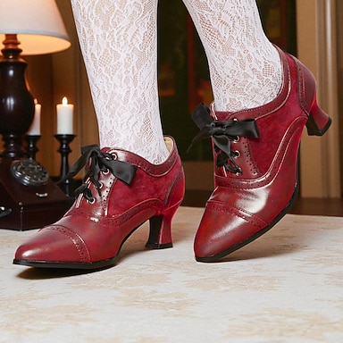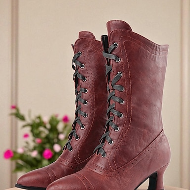 Botas victorianas con cordones de media pantorrilla para mujer, década de 1900: calzado de tacón retro de satén burdeos y piel sintética negra para disfraces históricos, fiestas Gatsby y representaciones teatrales.