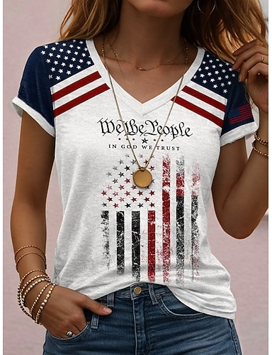 Día de la Independencia Aniversario Americano Camiseta Patriótica de Mujeres Estampado Gráfico Bandera Vintage Estilizada Clásica de Manga Corta Cuello en V Regular Tops Diarios Azul Negro Blanco