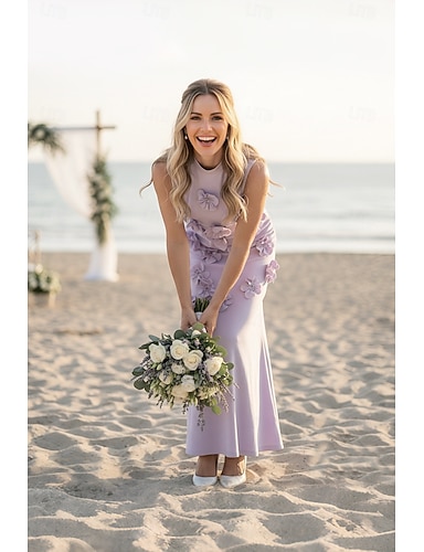 Dos Piezas Corte A Hasta el Tobillo Vestidos de invitada de boda Elegante Sin Mangas Cuello Barco Boda San Valentín con Flores 3D