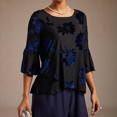 Mujer Tops elegantes Floral Elegante Mangas anchas Cuello Barco Diario Invitado a la boda Azul Marino Primavera, Otoño, Invierno, Verano