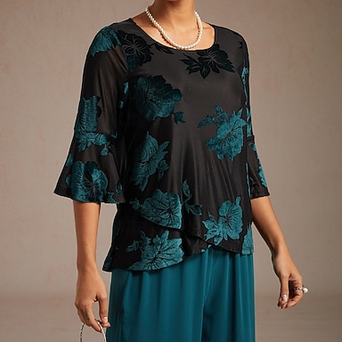 Mujer Tops elegantes Floral Elegante Vintage Boda Manga 3/4 Escote en Pico Tops regulares Invitado a la boda Ropa de fiesta de noche Púrpula Claro Primavera, Otoño, Invierno, Verano