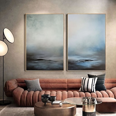 Conjunto de 2 pinturas abstractas de paisajes pintadas a mano, arte mural original, conjunto de 2 paisajes azules &Arte de pared para sala de estar con diseño acogedor en tonos grises