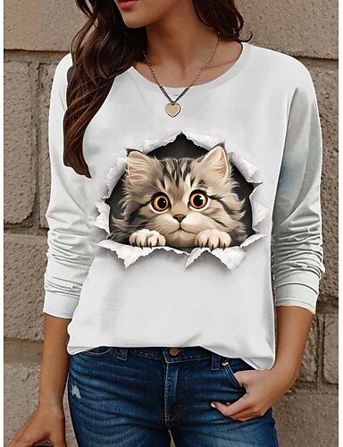Camiseta de mujer de cuello redondo de manga larga con túnica Gráfica Animal Gato Casual Tops Regulares Daily Print Blanco Otoño