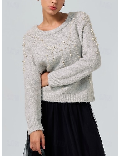 Suéter de punto de manga larga con cuello redondo y cuentas de perlas grises para mujer, jersey informal para uso diario en otoño e invierno.
