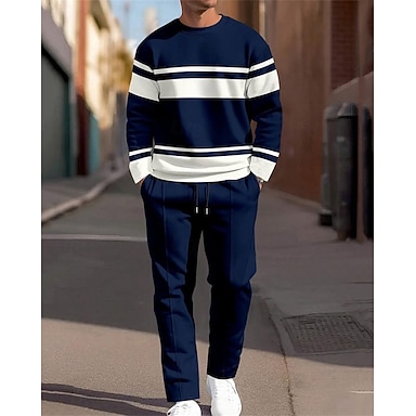 Chándal de 2 piezas con bloques de color para hombre: conjunto informal de sudadera y jogger con cuello redondo para uso diario en la calle.