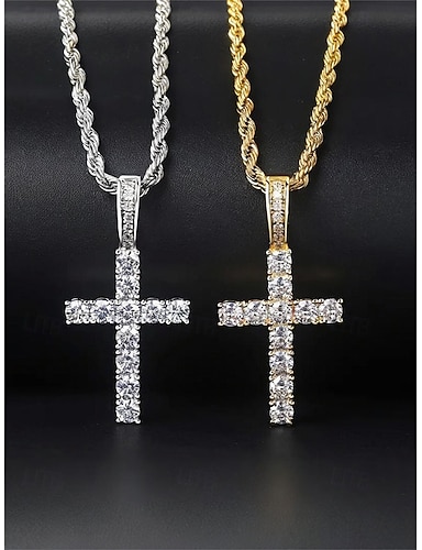 Collar con colgante de cruz para hombre, de cobre y circonita, disponible en colores oro y plata, con un diseño moderno y brillante, perfecto para viajes de vacaciones y para uso diario informal.