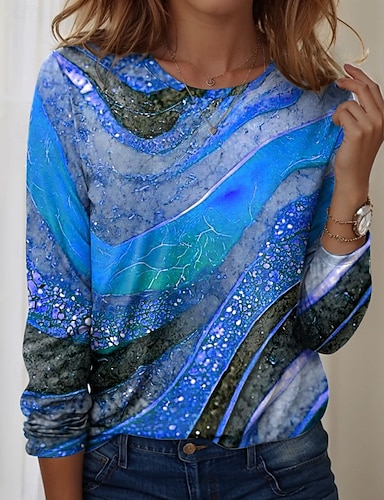 Mujer Camiseta Estampado Graphic Geométrico Oceano Vintage Moda Elegante Manga Larga Cuello Barco Tops regulares Diario Azul Piscina Negro Rosa Rojo Verde Trébol Verano Primavera