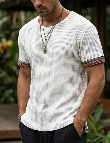 Hombre Camiseta con diseño de gofre Camiseta Camiseta superior Manga Corta Cuello Barco Verano Primavera Color sólido Ropa de calle Elegante Étnico Retazos Bordado Casual Diario Exterior Blanco