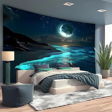 Tapiz surrealista de pared con playa nocturna, brillo bioluminiscente, océano, luna llena, cielo estrellado, arte de tela grande para dormitorio, sala de estar, dormitorio universitario, decoración
