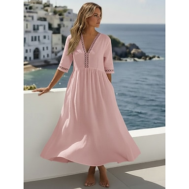 Mujer Vestido Midi Lino de algodón sintético Vestido informal Vestido de lino de algodón Moda Moderno Exterior Vacaciones Festivos Holgado Plano Media Manga Escote en Pico Azul Piscina Blanco Rosa