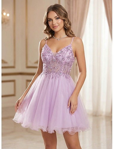 Corte Trompeta Sirena Corto Mini Trajes de gala Elegante Lentejuelas Sin Mangas Escote en Pico Reunión de Antiguos Alumnos Fiesta de Cóctel Tul con Cuentas