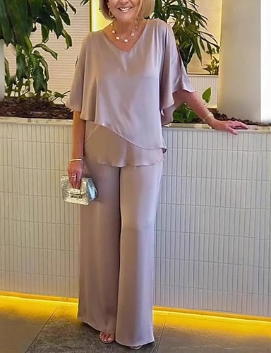 Mujer Blusa Conjuntos de pantalones Pantalones de pierna ancha Manga 3/4 Escote en Pico Plano Volante Moda Ropa de calle Diario Casual Diario Invitado a la boda Rosa Morado Caqui Primavera & Otoño