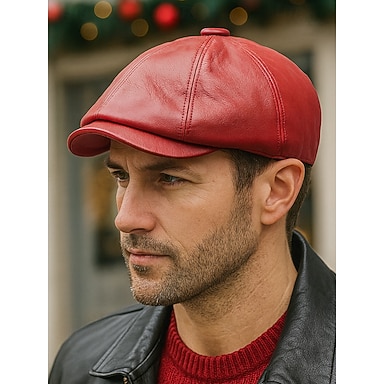 Gorra navideña de piel sintética para hombre: elegante gorra plana en rojo, marrón, negro y gris. Cálido gorro de invierno para hombre. Accesorio navideño de moda.
