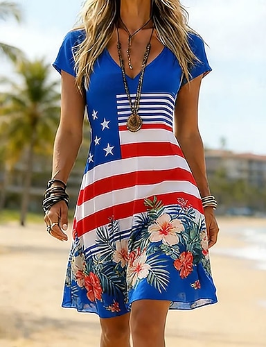 Día de la Independencia Aniversario Americano Patrón Camiseta para Mujer Gráfica Bandera Nacional Vintage Estilosa Clásica de Manga Corta Cuello Redondo Impresión Diario Fin de Semana Azul