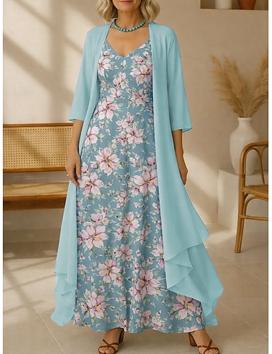 Mujer Conjunto de vestido Vestido de una línea Elegante Vacaciones Floral Graphic Multi capa Estampado Vestido maxi Manga 3/4 Escote en Pico Diario Vacaciones Rosa Morado Naranja Verano Primavera