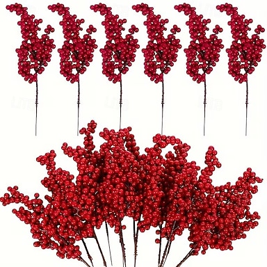 Juego de 15 piezas de tallos de bayas artificiales rojas, bayas de imitación de plástico para decoraciones festivas de bricolaje, adecuadas para árboles de Navidad y el día de San Valentín.