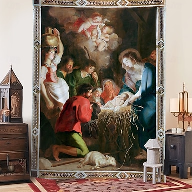 Tapiz Colgante de Navidad Escena de Natividad Estilo de Pintura al Óleo Nacimiento Gran Arte de Pared Decoración Mural Manta Cortina Decoración de Celebración en el Hogar Sala de Estar Dormitorio