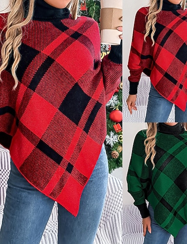 Suéter de Navidad para mujeres casual suave de cuadros de canalé cuello alto tejido de manga larga tops regulares tejido al aire libre diario fin de semana rojo verde otoño invierno