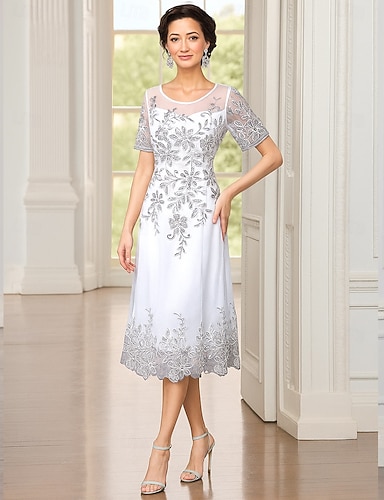 Vestido de fiesta largo A-Line Vestido cóctel Vestido de invitada de boda Vestido de la madre de la novia Manga corta Escote redondo Elegante Lujoso Formal mezcla de algodón con bordado