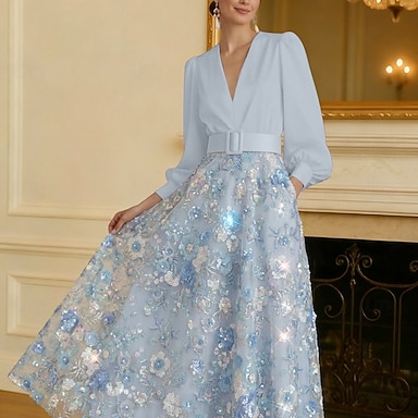 Vestido de invitada de boda largo hasta el tobillo estilo A Línea Vestidos formales Vestido de gala Vestido de la madre de la novia Manga tres cuartos Cuello en V Talla grande Brilla y resplandece