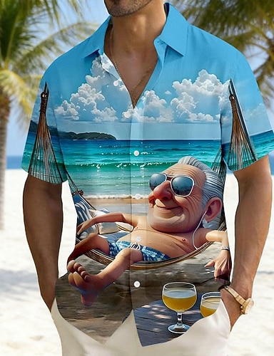 Hombre Caricatura Old Man Camisa camisa hawaiana Abotonar la camisa Manga Corta Gracioso Vacaciones Festivos Ropa de playa Verano Primavera Cuello Vuelto Impresión 3D Camisa tipo lino Azul Piscina